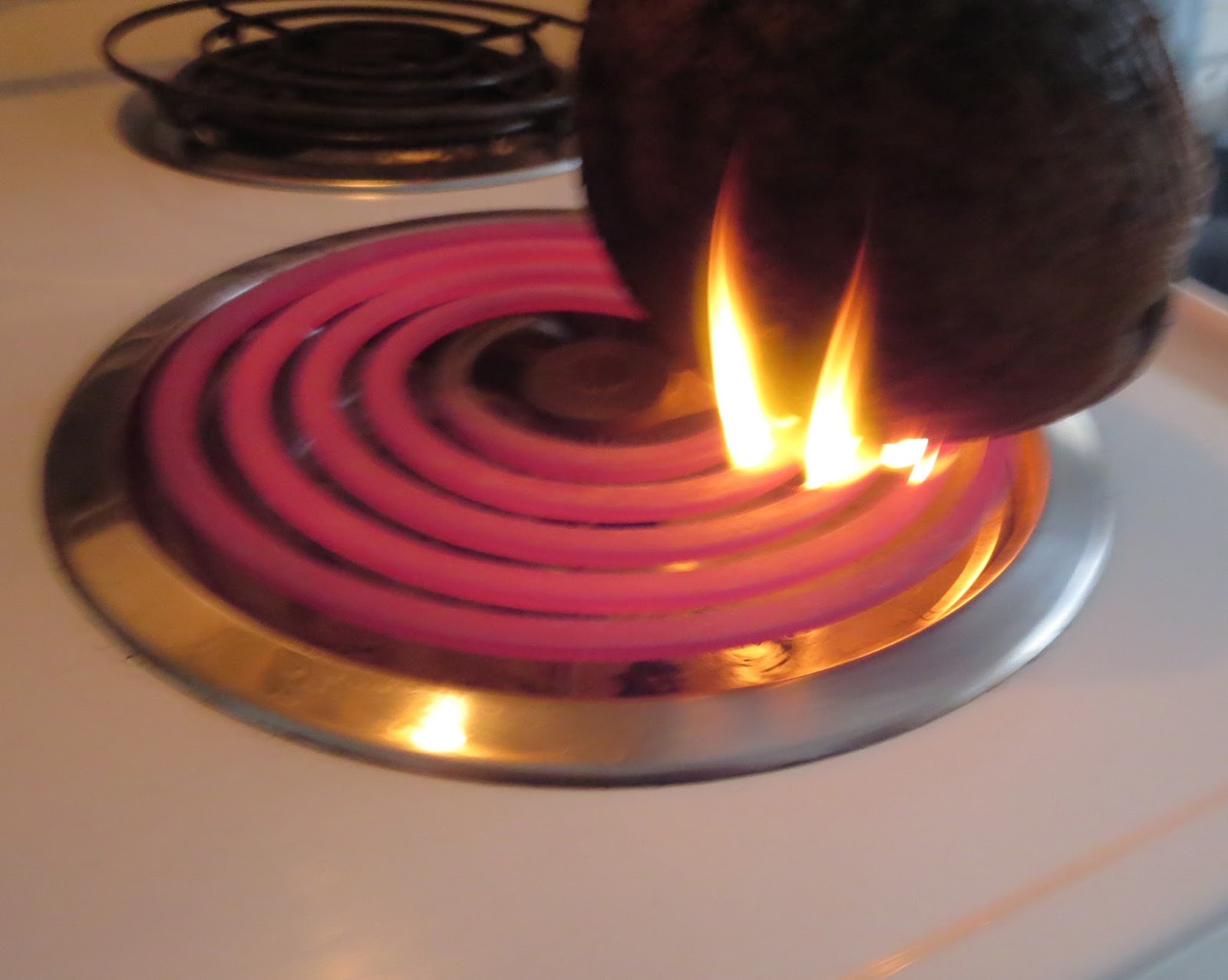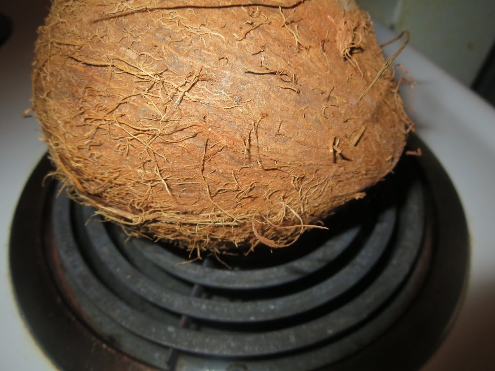 2.Pelar y cortar el coco en trozos.para pelar primero quitale todas las fibras de encima que no le quede ninguna al coco que no o prenderá en fuego , ponlo en la hornilla un minuto por cada lado para ayudar al coco a desprenderse de la cascara, luego con ayuda de cuchillo para la mesa tratar de desprender el coco por todos los bordes de la cascara .