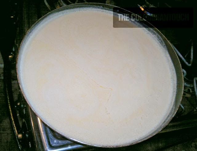 2.En un cazo de fondo grueso poner 1200 ml de leche , la panela raspada ,la mantequilla y llevar a hervir hasta que la panela este completamente disuelta y la mantequilla derretida.