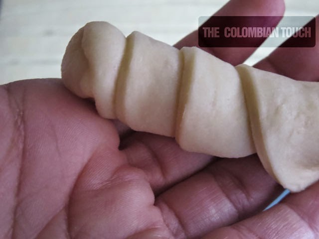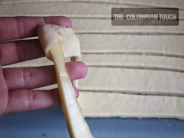 6.Envolver trozos de queso y/o guayaba con las tiras de masa y luego rodar sobre la mesa con ayuda de las manos las piezas ya hechas para apretar los bordes de la envoltura o sino se abrirán cuando frías los deditos