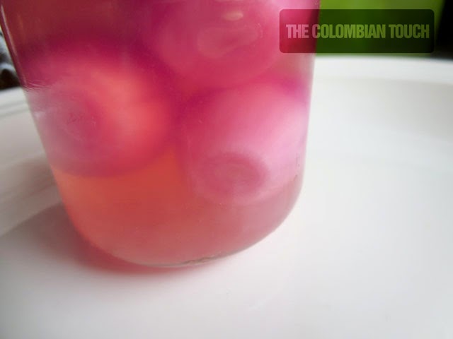 2.LLenar el 40% del frasco con jugo de limón fresco , agregar 40% de la capacidad del frasco en vinagre 20% de agua caliente y la sal cerrar el frasco dejar decolorarse las cebollitas por casi 2 días hasta que estén de color pálido y hayan manchado de color el liquido.Puedes usar solo vinagre en lugar de la combinación vinagre limón , si no te molesta el sabor fuerte de este.