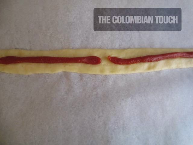 4.Amasar el bocadillo para ablandarlo y luego formar tiras largas con las manos ligeramente humedecidas para que no se pegue el bocadillo a la manos .Cortar porciones de 42 gramos mas o menos , cilindrar aplanar disponer el bocadillo encima cerrar cuidadosamente.