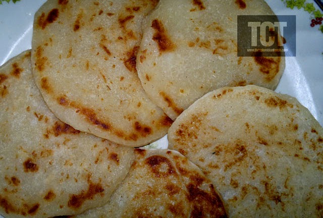 6.En un sarten anti-adherente a fuego medio y ligeramente engrasado disponer cantidades de la masa cuando los bordes de la arepa se vean mas secos y la arepa tenga apariencia firma voltear para que se dore el otro lado.