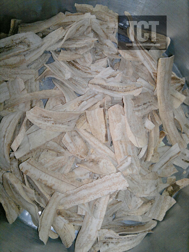 1.Pelar y cortar en tajadas largas y delgadas el plátano.