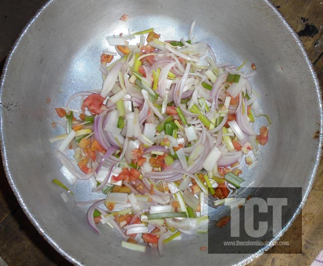 3.a parte en un sartén con un poco de aceite hacer un sofrito con el tomate, las cebollas y ajies finamente picados, ajo, comino, color y una pizca de sal si hace falta