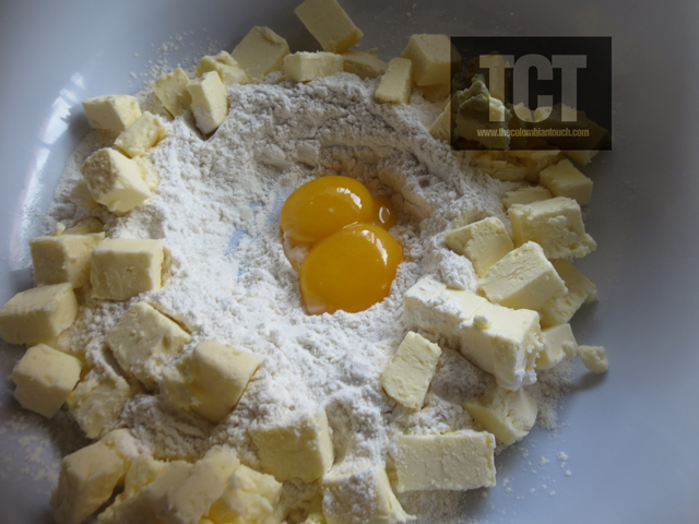 2. En la mezcla de los secos disponer la mantequilla bien fría y mezclar con cuidado solo buscando espolvorear la mantequilla con la harina , hacer un volcán y en el centro poner la cantidad de huevo.
