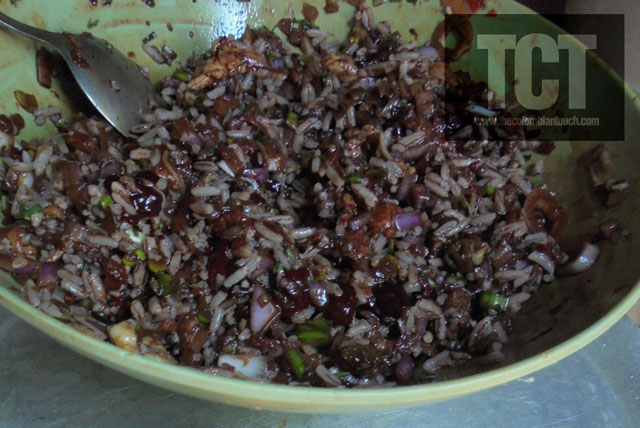 2.en un recipiente mezclar las verduras picadas, el arroz cocido, la sangre,la pechuga, los condimentos, sal al gusto y revolver muy bien.
