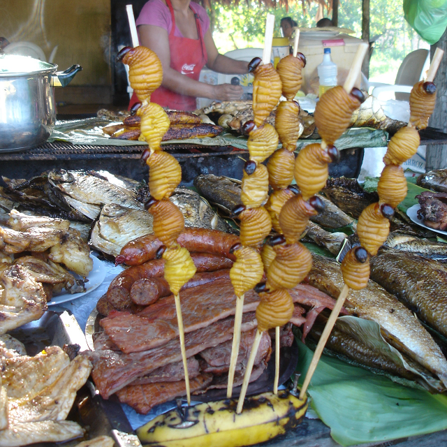 Recojiamos esos gusanos de las palmas tumbadas de vino o de ñoli de las que estaban casi podridas así era mas fácil sacarlos, los espolvoreábamos con sal y con una vara los traspasábamos desde el rabo hasta la cabeza para asarlos, son sabrosos tienen un gusto a chicharrón cremoso.