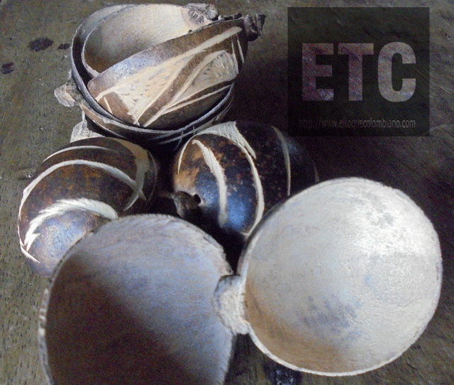Con el totumo o calabazo los dos nombres mas comunes en Colombia se hacen también maracas, tomumas, cucharas lamparas y bisutería.
