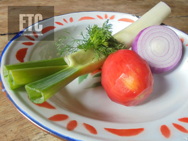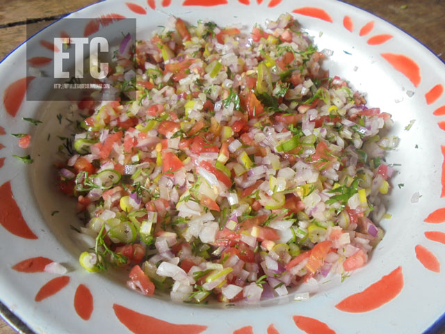 2..Cortar finamente el tomate, la cebolla rama, la cebolla cabezona y el cilantro.