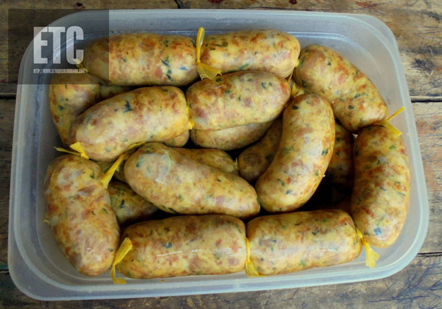 5..Amarre cada chorizo de 10 a 12 centímetro y ademas las puntas para que no se desbaraten. Hay que dejar los chorizos un poco sueltos por que al cocerlos la tripa se recoge un poco.