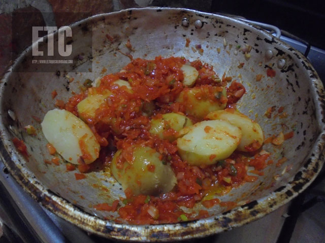 5..unir las papas peladas con el sofrito y mezclar muy bien hasta que se integren todos los ingredientes.