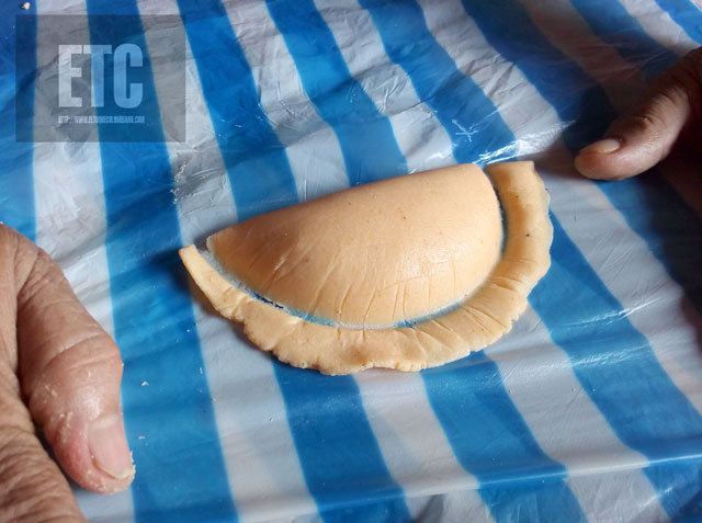 5..Tomar porciones de masa del tamaño deseado y aplastar hasta lograr un grosor de 3 a 5 mm, luego poner relleno, doblar hasta darle forma de media luna, presionar los bordes para que no se salga el relleno y luego cortar con un molde redondo.