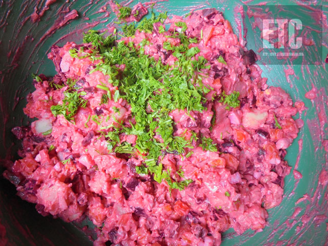 Ensalada de remolacha, zanahoria y papa, aderezada con mayonesa y limón.