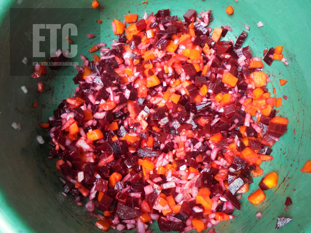 2..Picar en cubos pequeños las verduras y mezclar muy bien.