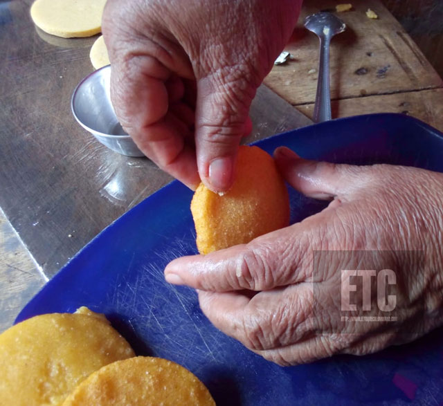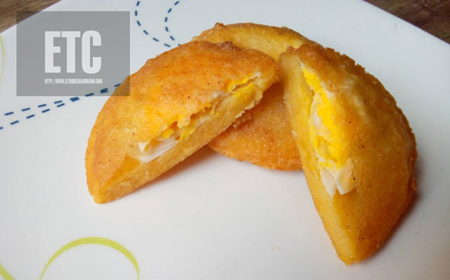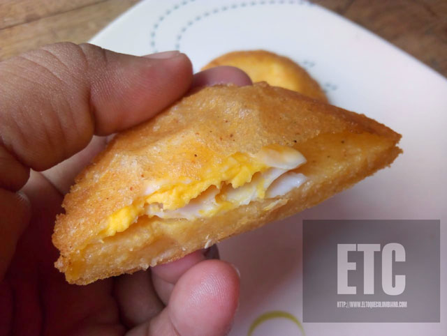 Fruto del sarten preparada con masa de maiz amarillo o harina de maiz pre cocida dándole una forma aplastada y circular donde se fríe por primera vez para luego agregar el huevo dentro y freír por segunda vez para cocinar el huevo y dorarla un poco.