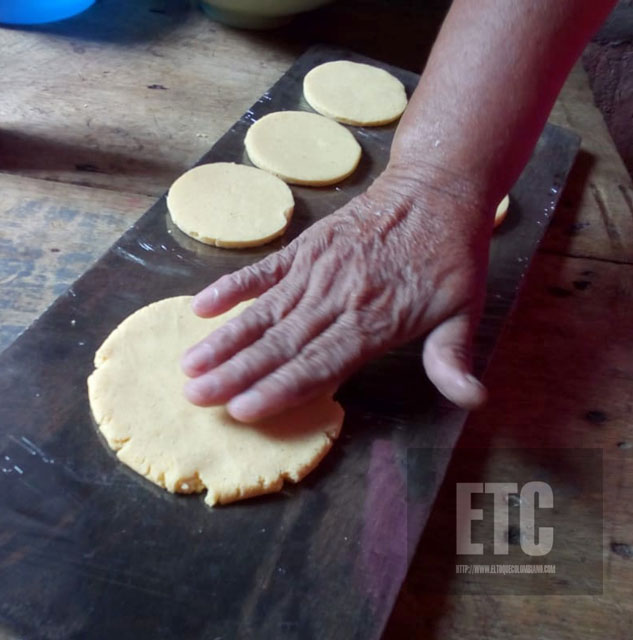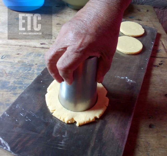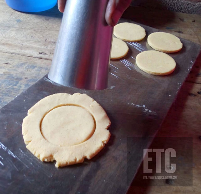 3..Tomar porciones de masa, aplastar con la mano dándole un grosor de 5 a 7 mm, cortamos las arepas con un molde para que todas nos queden del mismo tamaño.