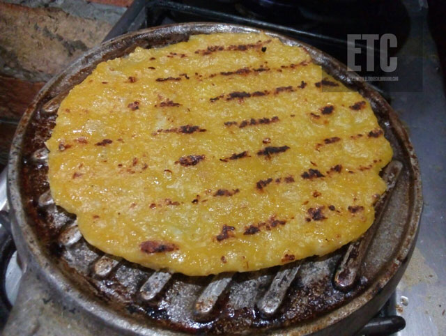 5..Calentar un tejo y poner porciones de masa de maiz sobre hojas de bijao y formar las arepas, luego colocar otra hoja de bijao por encima para poder voltearla.