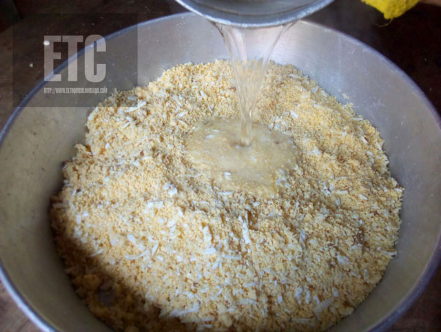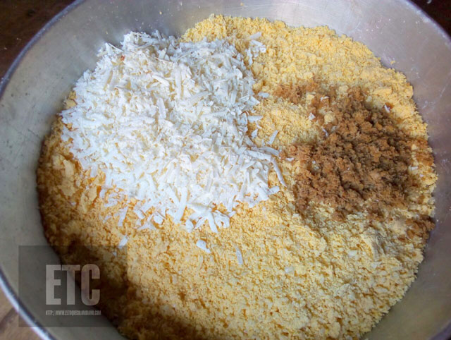 3..Agregar al maiz molido la panela raspada y el queso rallado.
