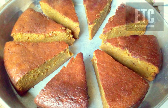 Bizcocho preparado con puré de ahuyama, harina de trigo, endulzado con panela, aromatizado con canela en polvo y nuez moscada.