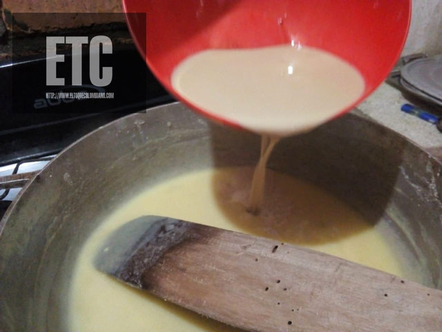 3..Agregar la mezcla de panela y leche al caldero, cocinar por unos minutos mas.
