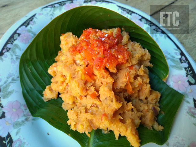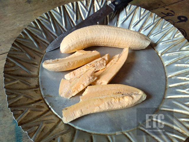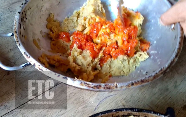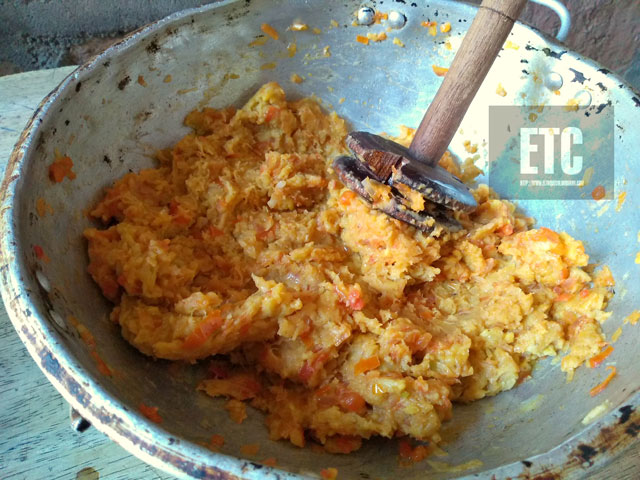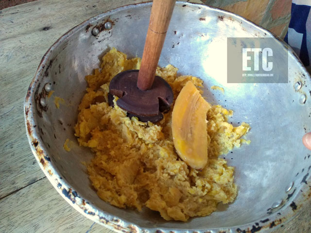 4..Sacar los trozos de plátano cocido del agua, maserarlos aun estando caliente hasta obtener una textura suave.