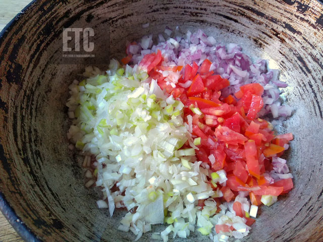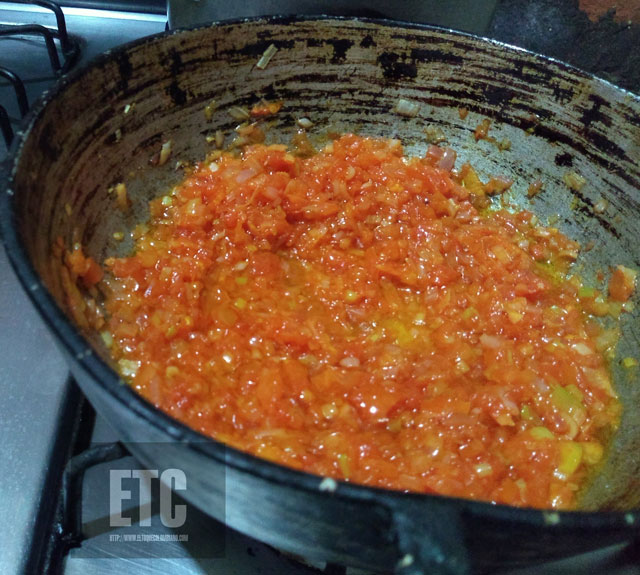 3..Mientras se cocinan los plátanos picamos el tomate, la cebolla cabezona, la rama de cebolla, el ajo y hacemos un sofrito agregando un poco de aceite. Reservar.