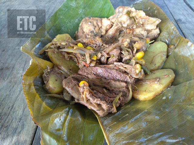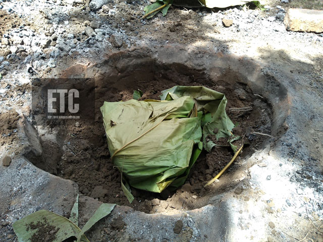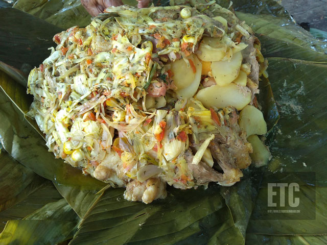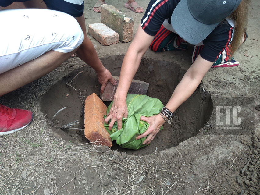 La Siguiente receta es el intento de reproducción de la técnica tradicional de cocina de horneado bajo tierra dicha técnica y preparación se encuentre dentro de la cocina en riesgo a desaparecer por poca cantidad de portadores actuales conocedores de la preparación. Para la reproducción de esta receta nos apoyamos en conocimiento y recuerdos de Janeth Nestiel y de mi madre Tatico.
