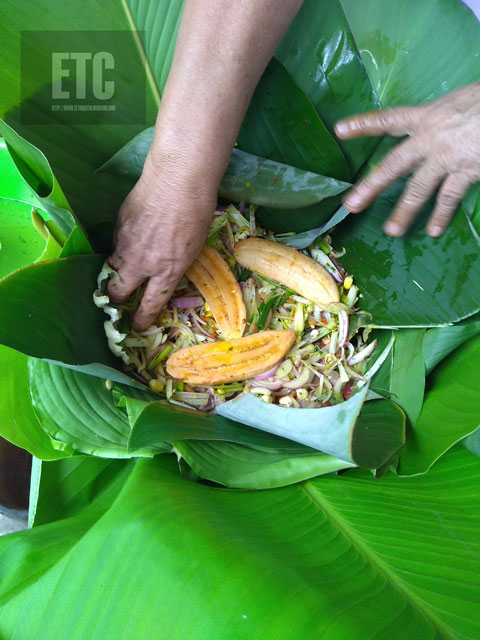2..Ayudándonos de una olla o un recipiente hacemos una cama de hojas de bijao y vamos agregando los ingredientes en capas, una de plátano, luego verdura, una de carne, verdura,papa, pajarilla, verdura y así sucesivamente hasta terminar.