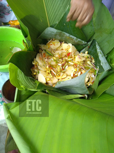 Pelamos las papas y las cortamos en rodajas, lo mismo le hacemos al plátano maduro, desgranamos la mazorca, aparte picamos las cebollas, el repollo, ají, las hojas de orégano, cimarrón y mezclamos muy bien.