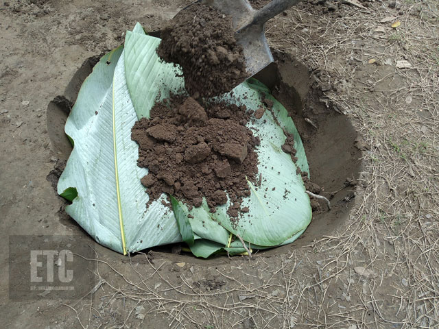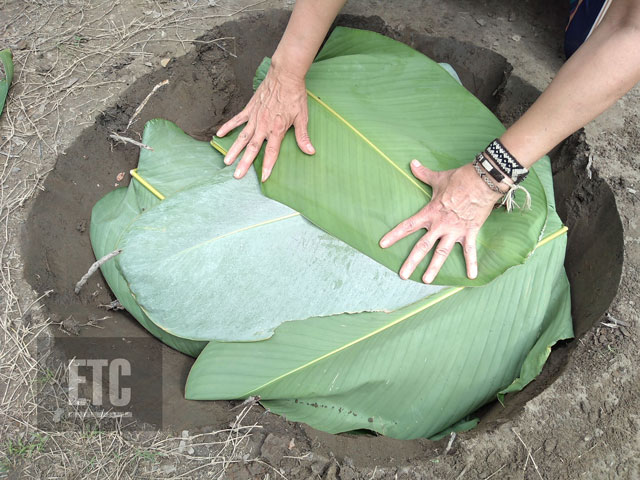 5..Tapamos con mas hojas por encima, ponemos tierra o arena y luego prendemos la leña y dejasmos cocinar de 4 a 8 horas dependiendo la proteína que usemos.