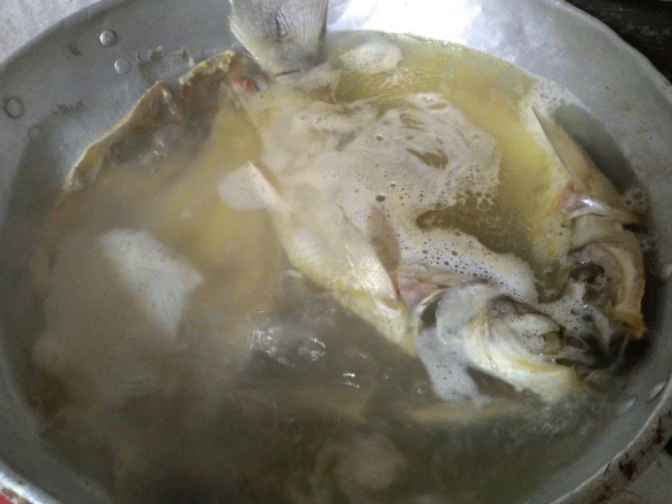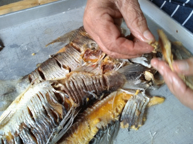 4..Apagar el fuego, sacar los pescados del agua y quitarles las espinas dejando la mera pulpa .