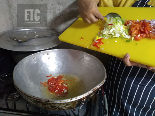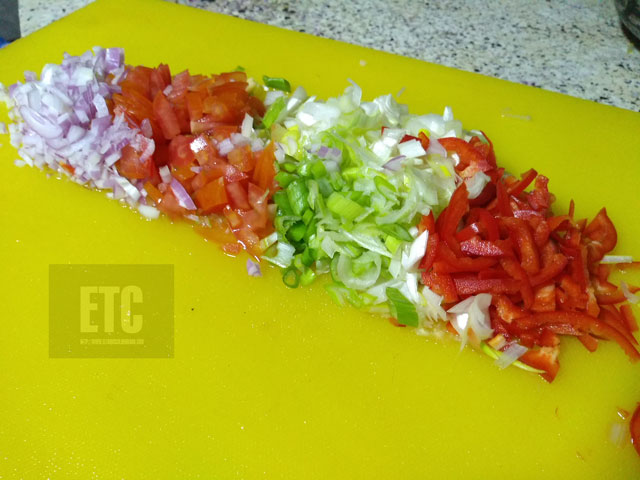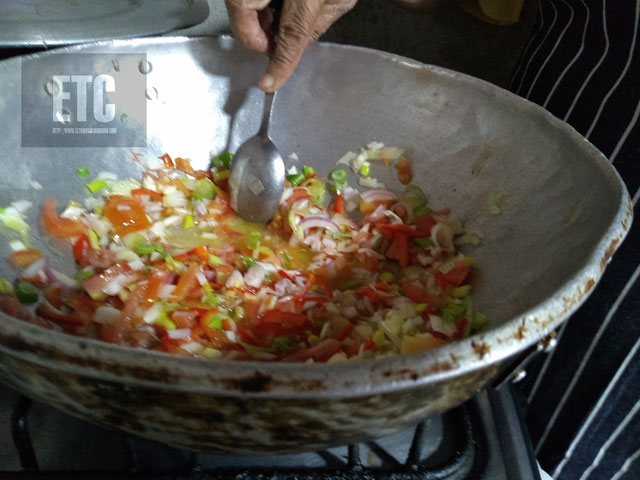 3..Mientras tanto hacemos el sofrito con las verduras picadas, llevándolas a un sarten con un poco de aceite, ajo, comino y color.Reservar