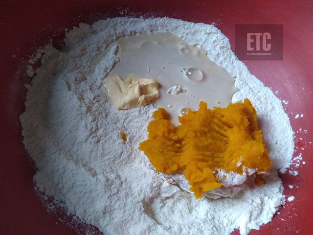 3..En un recipiente aparte agregar la harina, azúcar, la levadura ya activada, el aceite, la sal, el puré de ahuyama,un poco de agua si hace falta y mezclar todo muy ben.