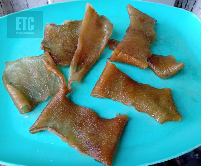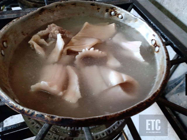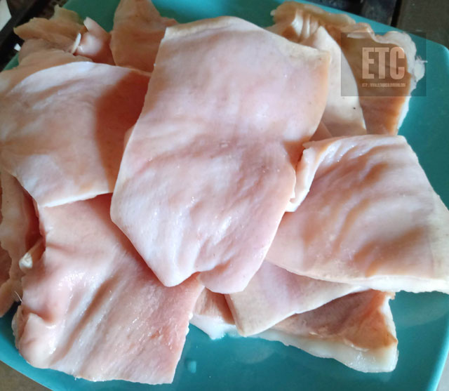 2..Luego de cocido terminamos de retirar la grasa de la piel de cerdo y lavamos de nuevo.