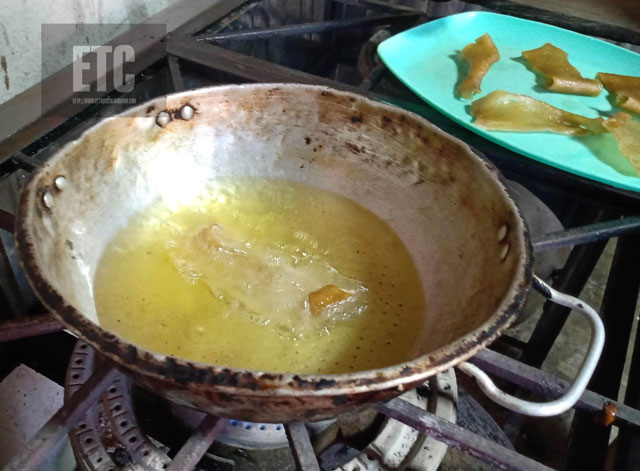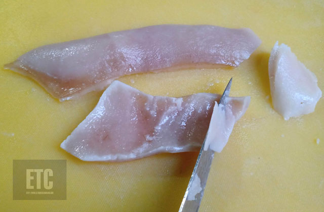 1.Retirar la grasa del tocino por que solo utilizaremos la piel del cerdo, cocinar en agua y un poco de sal hasta que al pincharlo con un palillo se sienta suave.