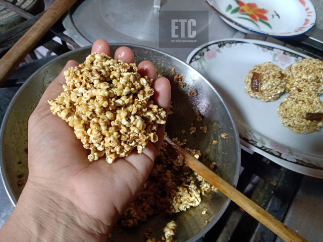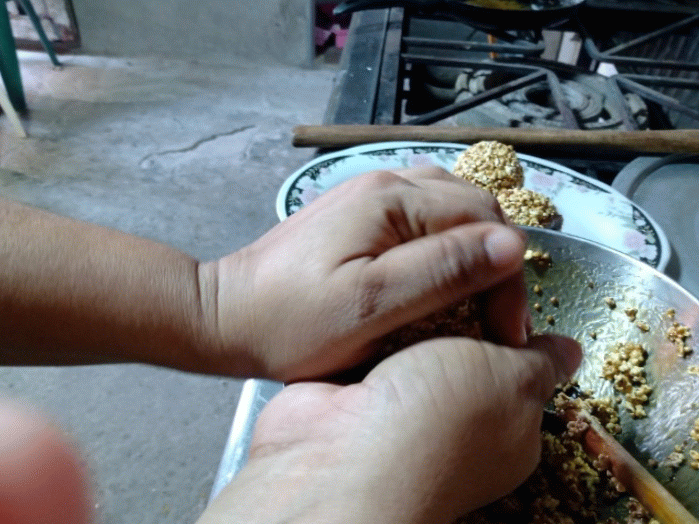 5..Sin dejar enfriar totalmente armamos las alegrías con las manos húmedas para que no se nos pegue, dándole así una forma redonda con su respectivo pedazo de coco cada una.