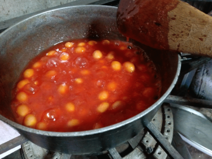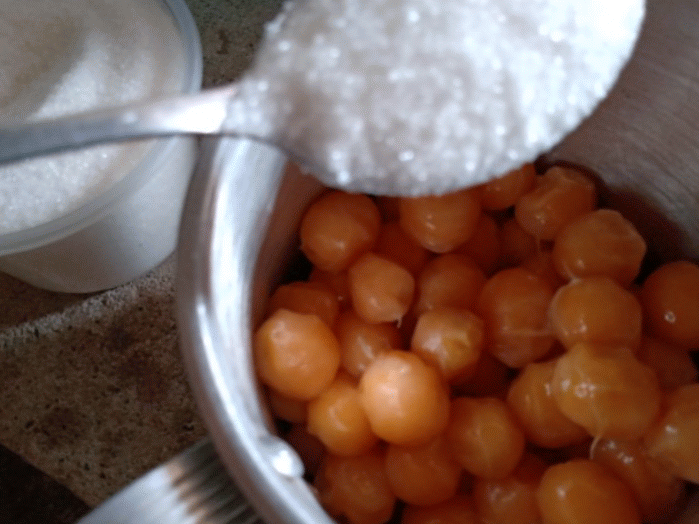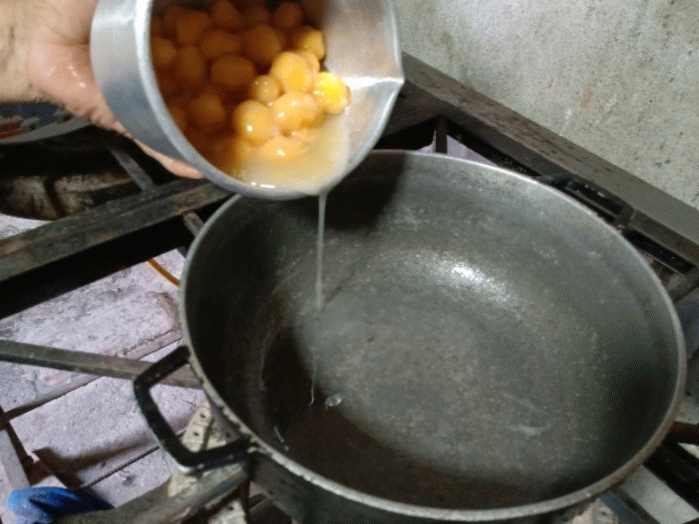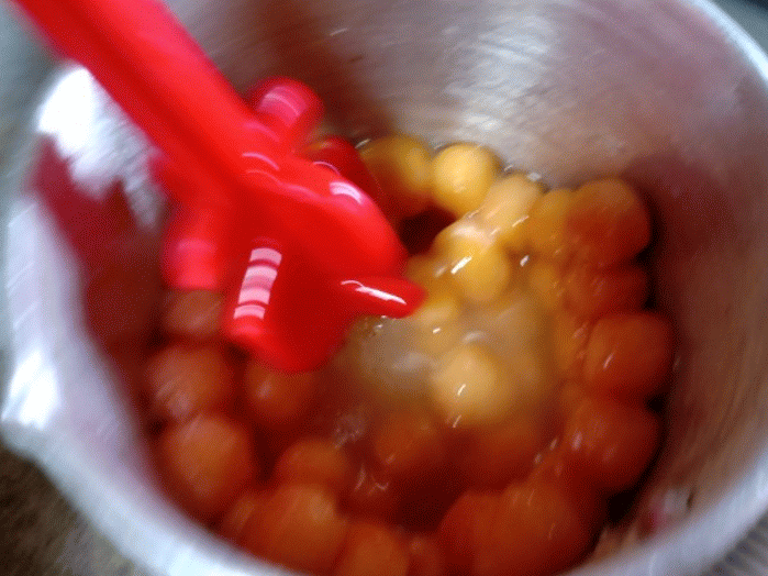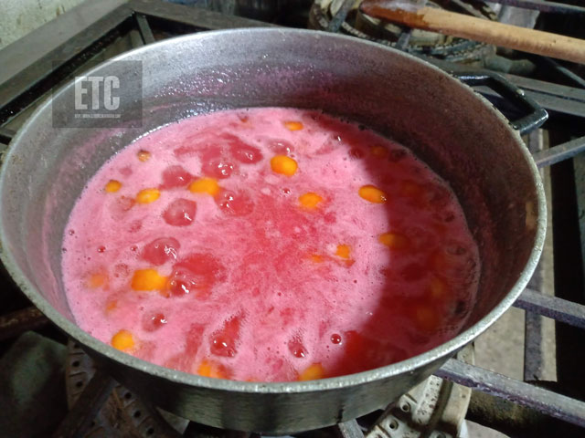 3..Poner en un caldero, agregarle el resto del azúcar, el baso con agua, una gota de color comestible y cocinar a fuego medio por 40 minutos hasta que las pepas se cocinen.