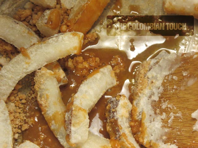 La presentación en tajadas o palitos es mas común en la región pacifica , puedes encontrar para comprar en carretas de venta callejera en las calles de Bogota mientras en los pueblos de región caribe es mas común encontrar esta misma preparación pero en trocitos muy chicos que envuelven en un conitos de papel lo suelen vender en tiendecitas de barrio o en carretas de venta callejera frente a las escuelas colegios donde hacen de la delicia de niños y jovencitos.