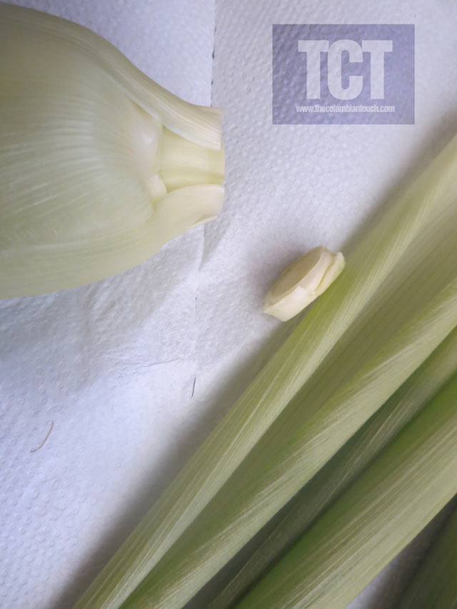 1.Pelar las mazorcas haciendo un corte en extremo mas grueso y reservar las hojas llamados ameros o capachos.