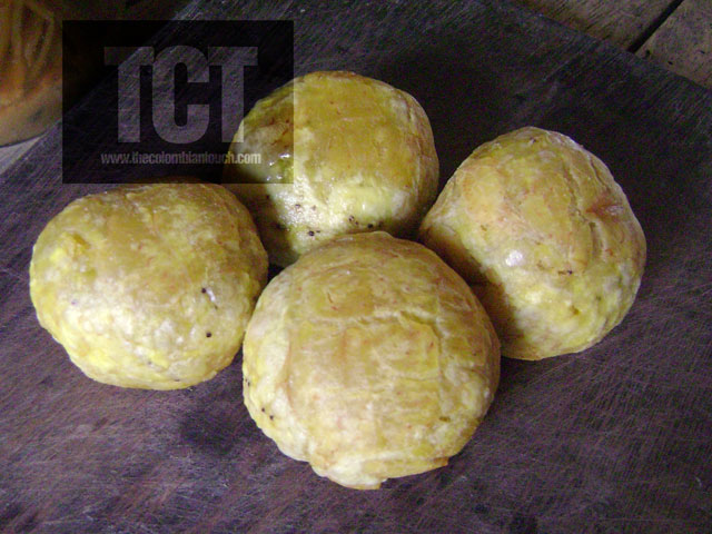 fruto del sartén elaborada a base de plátano hartón verde o pinton, relleno con carne de cerdo o chicharrón la cual se le da doble cocción .