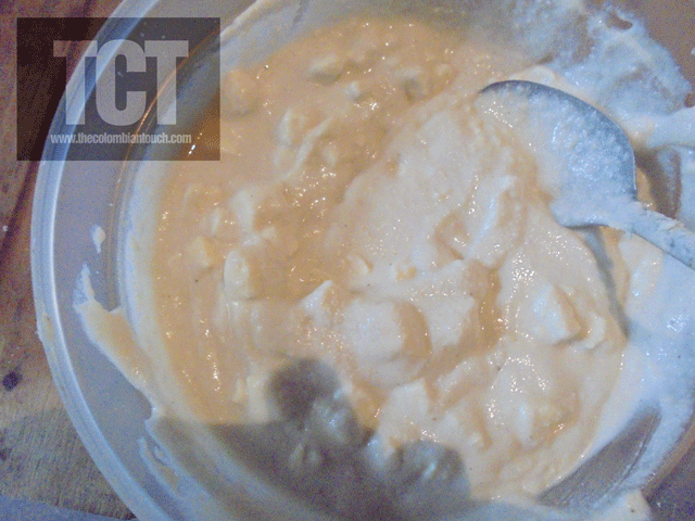 4.agregarle la pizca de azúcar, el queso picado o rallado a la masa y mezclar muy bien.