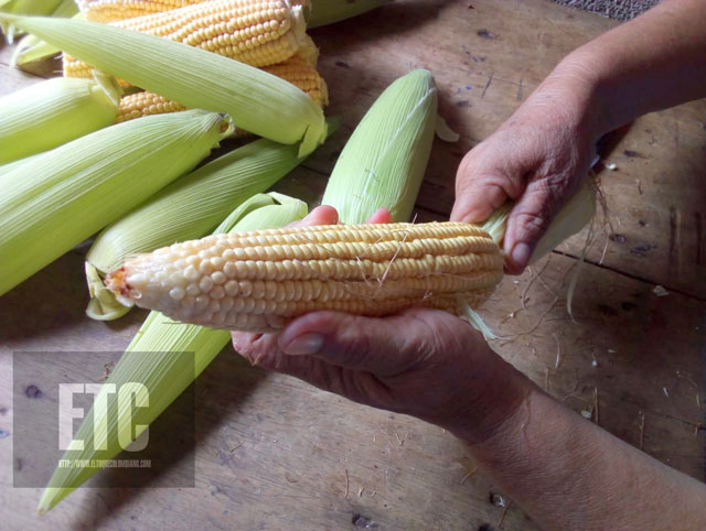 1.Para obtener los granos de maiz hay que pelar las mazorcas, cortar el grano con un cuchillo filoso y luego pesar la cantidad de maiz que necesitaremos para la receta.