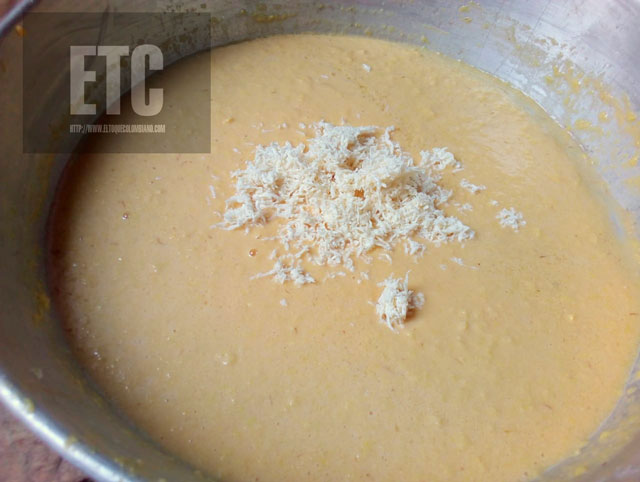 3..Ya teniendo el maiz molido le agregamos los huevos, la mantequilla, la leche, el azúcar, el queso, el polvo de hornear y mezclamos todo muy bien.